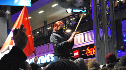 Kurz nach 18Uhr schlug die bis dato ruhige Stimmung plötzlich um. Die circa 3000 Gegendemonstranten begannen laut zu pfeifen, Buh- und „Pfui!“-Rufe erfüllten die Straßen um den Kölner Dom, als die ersten Deutschlandflaggen von den Hooligans auf dem Bahnhofsvorplatz sichtbar wurden. Immer mehr friedliche Protestler versammelten sich vor den Polizei-Absperrungen und stimmten Chöre an: „Es gibt kein Recht auf Nazipropaganda“, „Nazis raus, Nazis raus“, „Hogesa, Pegida, ihr marschiert nie wieder“. Hier und da hörte man Trommler und Musik, manche Menschen tanzten im Licht der Laternen. Die Masse war so laut, dass zu bezweifeln ist, ob die Kögida bei diesem Lärm überhaupt die Kundgebung vernünftig abhalten konnte.