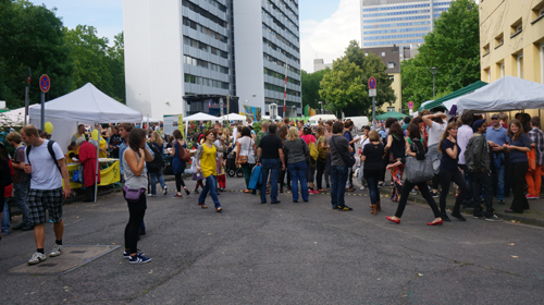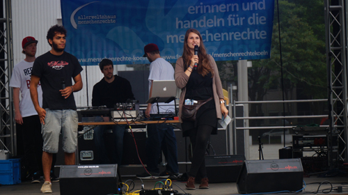 Das Menschenrechtsfestival auf dem Gelände des Quäker Nachbarschaftsheims am Sonntagmittag kommt zunächst stockend in die Gänge: Letzte organisatorische Kleinigkeiten müssen geregelt werden und das Wetter will anfangs nicht so recht mitspielen. Das Festival wurde 2013 vom kürzlich verstorbenen Mitarbeiter des Kölner Allerweltshauses, das auch Trägerverein der Veranstaltung ist, und Leiter des Projektes „Erinnern und Handeln für die Menschenrechte“ Adnan Keskin ins Leben gerufen. Ihm gedenken zwei der insgesamt 15 ehrenamtlichen Mitorganisatoren und Mitarbeiter des Projektes Elisabeth Pütz und Johannes Schweitzer vom Informationsbüro Nicaragua während ihrer Einführungsrede auf der Festivalbühne, auf der später Bands wie Hop Stop Banda, Waduh! und Mr. Shirazy & The Exile Orchestra auftreten werden.