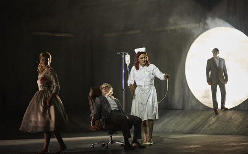Man könnte meinen, Regisseur John Fulljames und Bühnenbildnerin Magdalena Gut hätten sich von einer der größten Baustellen im Ruhrgebiet inspirieren lassen. Einen Raum wie jenen, in dem dem alten Faust sein Leben noch einmal vor dem inneren Auge vorbeizieht, kennt der geneigte Lokalzeitungsleser überall längs der Emscher: ein riesiges unterirdisches Regenwasser-Reservoir mit gewaltigen Ein- und Ausläufen sowie Entlüftungsschächten an die Oberwelt. Auf den Bildern aus der echten Welt stehen behelmte Ingenieure in den unwirtlichen Riesenhallen und verkünden das nahende Ende der Riesenkloake im Bett der Emscher. Auf der Bühne der Dortmunder Oper erwartet Faust – in der Adaption von Charles Gounod – offensichtlich sein eigenes baldiges Ende. Neben dem ledernen Chefsessel, in dem der Alte sich nur noch mühsam aufrecht hält, steht der Infusionsständer. Überwacht wird der Tropf von einer großen Schwester mit knallroter Mähne. Eine stattliche Erscheinung. Gar eine Transe? – Nein, es ist der Teufel persönlich, der sich da in dieses irreale Krankenzimmer eingeschlichen hat.