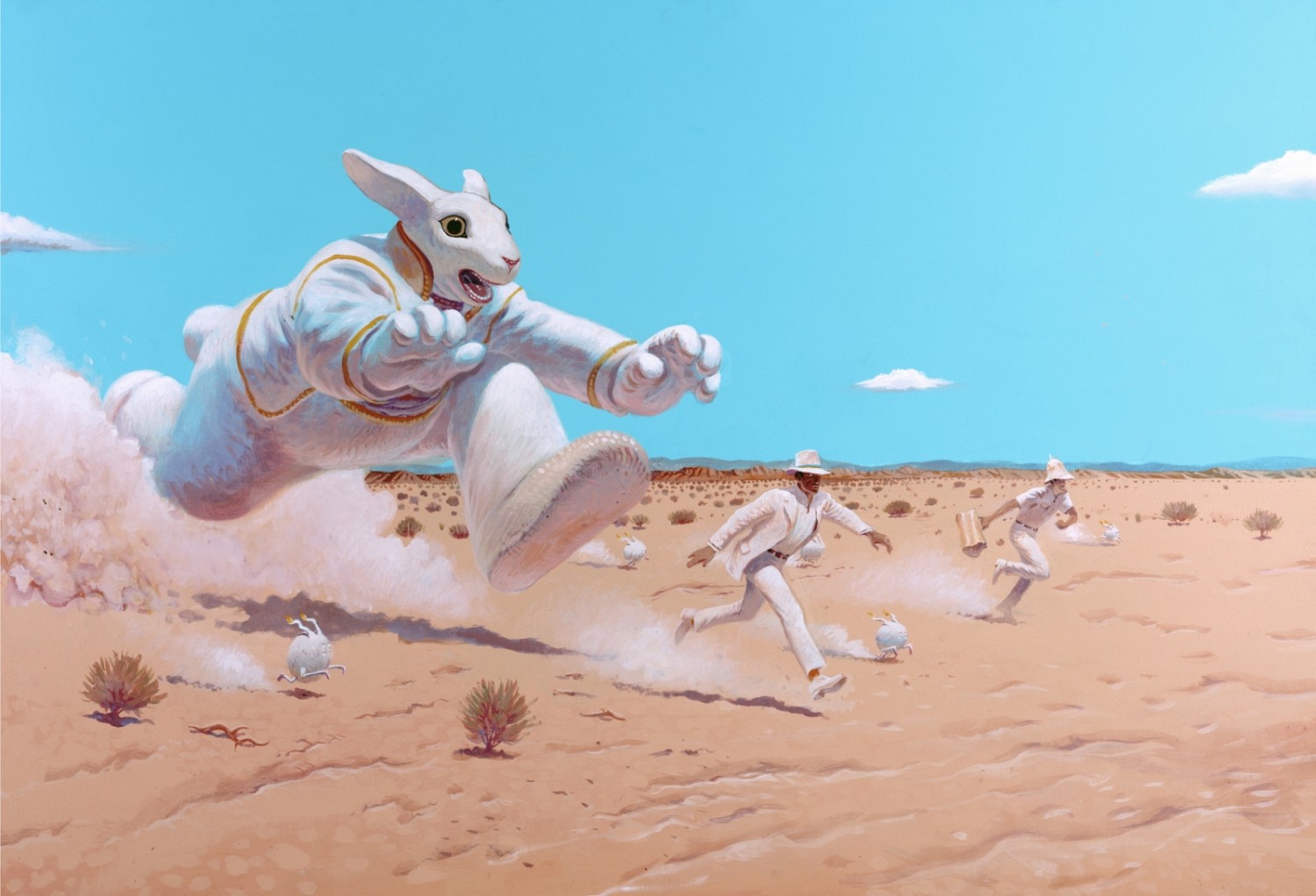 Wie groß sein Einfluss auch in der Science-Fiction-Filmindustrie war – „Blade Runner“ (1982), „Abyss“ (1989) oder „Das fünfte Element“ (1997) – ist in der wunderbar mit übergroßen zentralen Einzelbildern und Szenerien aus den Serien choreografierten und auch thematisch gegliederten Ausstellung nicht vergessen. All die Akribie und Detailverliebtheit beispielsweise in der einer Lithografie wie „Feuerstadt. Die Garage“ (1985), wo Frösche, Hefte und Farbeimer in einem surrealen Hangar mit gigantischen Flugwesen hüpfen, liegen und rumstehen. Das muss alles erst einmal entdeckt werden, dazu die Utopien des Wunderbaren. Das ist eine grandiose Kunstschau für Quereinsteiger (für die ist der tolle Katalog ein Muss) und auch für Fans, die selbst die Geschichte vom roten U-Boot kennen – für die warten viele Originalblätter und großformatige Originale in Acryl und Aquarell.