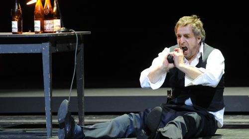 Es ist reichlich leer auf der Bühne. So, als sei man versehentlich in eine Probe geraten. Und der, der am Rand wie ein Regisseur an seinem Tischchen sitzt und schreibt, scheint auch mit keinem Publikum gerechnet zu haben. Reichlich derangiert sieht er aus, was mit der Flasche vor ihm zu tun haben dürfte. Mal schauen, was das wohl gibt, denkt sich der Zuschauer, lehnt sich zurück und wird direkt wieder aus seiner Behaglichkeit aufgescheucht – von eigenartigen Zuspätkommern, die sich umständlich durch die Reihen wurschteln. Eine vermeintliche Zuschauerin erhebt sich aus den ersten Reihen und betritt als selbsternannte Muse die Bühne.
