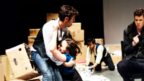 Wie sich diese beiden Szenarien verknüpfen, bleibt allerdings etwas unscharf: Geht es um Skepsis gegenüber der Abhängigkeit von digitalen Speichermedien, um Kritik an der analogen Archivpraxis oder eher um ein Plädoyer für mehr kollektive und individuelle Erinnerung? Der Abend stellt beide Katastrophenszenarien eher nebeneinander, ohne sie direkt zu verknüpfen. Die jungen Darsteller der „theatergruppe köln“ der Jungen Theatergemeinde spielen sich mutig durch Becketts schweren Text. Jonas Nicola Drouvé ist ein nörgelnd-fordernder Hamm, dessen Dauer-Reden immer auch die Versicherung der eigenen Existenz bedeutet. Valentin Schwerdtfeger als Clov wuselt dagegen als selbstbewusstes Faktotum hin und her, ohne je unterwürfig zu sein. Marie Neuhalfen und Müjdat Yüksel als Nagg und Nell ergänzen das Duo. Nicht immer sind die jungen Schauspieler den Ansprüchen des Textes gewachsen, gelegentlich fehlt es an darstellerischen Farben, doch insgesamt schlägt sich die Truppe wacker und macht neugierig auf mehr.