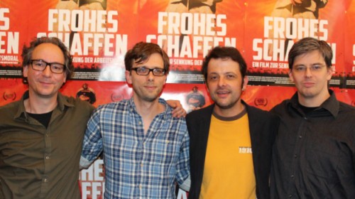 Mittwoch, 1. Mai: Der Tag für die Premiere von Konstantin Faigles („Die große Depression“) neuem Film „Frohes Schaffen – Ein Film zur Senkung der Arbeitsmoral“ war gut gewählt: Am 1. Mai, direkt im Anschluss an die traditionelle Mai-Demonstration, feierte der dritte Kinofilm des Regisseurs seine Premiere im Kölner Odeon-Kino. Im Film, der u.a. vom Odeon-Theaterleiter Martin Roelly produziert wurde, geht es nämlich um die Bedeutung der Arbeit und warum die heutige Industriegesellschaft zwischen Burn Out und Hartz IV pendelt. Konstantin Faigle hat darin eine ganze Reihe Experten aus der ganzen Welt zu Wort kommen lassen, die typischen „Talking Heads“-Aufnahmen eines Dokumentarfilms aber immer wieder durch Spielszenen unterbrochen, in denen Archetypen der Arbeitswelt charakterisiert werden und zur Belustigung des Publikums auch aufeinander treffen.