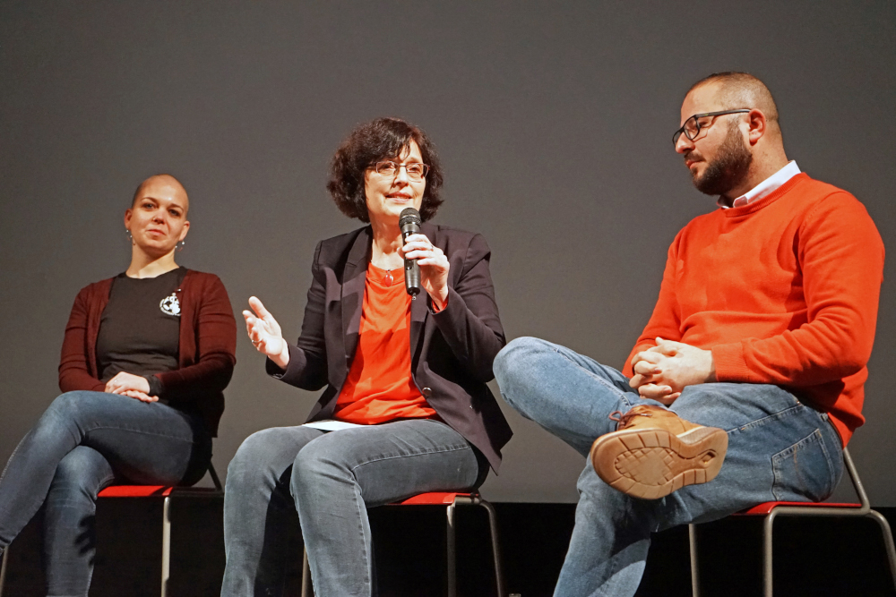 Moderatorin Franziska Hilfenhaus kündigte von einem der auf die Kino-Vorbühne gestellten Stühle aus eher eine allgemeine Diskussion über die aktuelle Situation an den EU-Außengrenzen und die derzeitig diskutierten politischen Maßnahmen an. Sarah Schneider, Vorsitzende der NGO Medical Volonteers International, redete als erste Rednerin dann gleich Klartext: „Die Lage ist katastrophal, sie ist unmenschlich. Sie kriegen an den Grenzen keine medizinische Versorgung, sie kriegen nicht ausreichend Nahrung, haben kein Dach über dem Kopf. Menschen werden als Spielball von kruden politischen Entscheidungen benutzt.“ Ihre NGO habe zur Zeit keine Projekte in Belarus, über dessen Methoden und die Reaktion der polnischen Seite Agnieszka Hollands Film berichtet. Sarah Schneider kritisierte auch die jüngsten Beschlüsse der Bundesregierung durch die „sämtliche Organisationen, die auf dem Landweg arbeiten, kriminalisiert würden. Wir müssen das alles ändern. Erst die Menschwürde achten, dann erst alles andere.“ Sie betonte: „Push-Backs, die wir gleich im Film sehen werden, sind theoretisch verboten“.