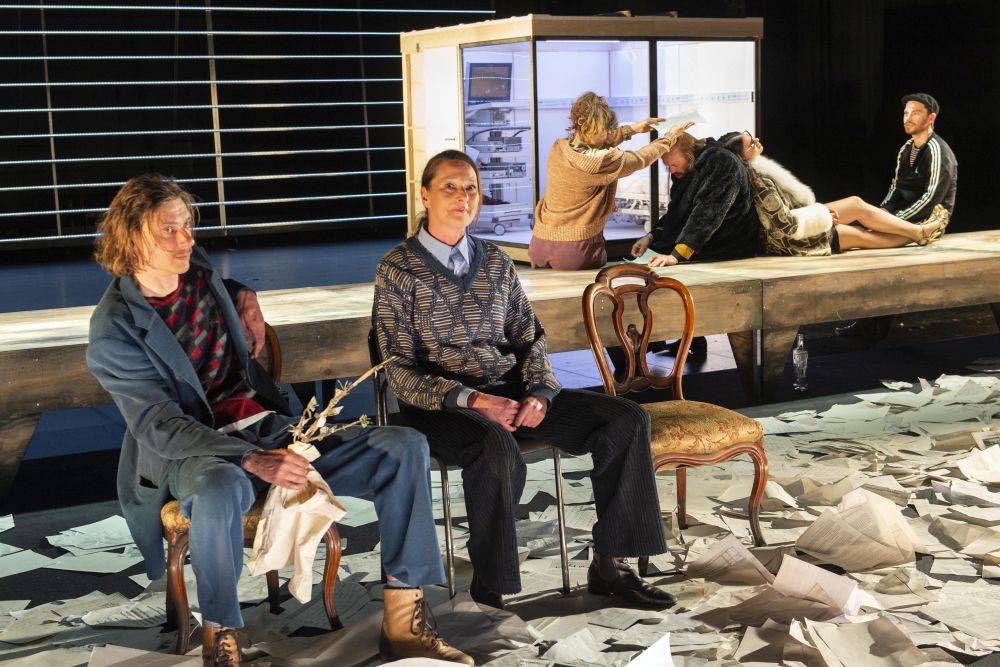 Alexander Serebrjakow hat alles im Griff – nur sein Leben nicht. Der abgehalfterte Schriftsteller (Daniel Stock) zieht sich aus Finanzgründen auf sein Gut zurück und beherrscht nun die gesamte Zeit die Bühne: Im Hintergrund hat er sich hinter einer gewaltigen Neon-Lamellenwand ein Schreibkabinett eingerichtet. Der Bühnenvordergrund ist dagegen übersät mit den Papierbergen seiner Entwürfe. Dazwischen Leben und Tod: ein bühnenbreiter Tisch, an dem gesoffen, auf dem getanzt und gelitten wird. Wirklich sympathisch ist Serebrjakow nicht. Zwar versucht er mit dem Schreiben die Familie über Wasser zu halten, die Anklänge an Tschechow sind offensichtlich, aber er nölt auch, ist selbstverliebt, trifft Entscheidungen nach Gutsherrenart.