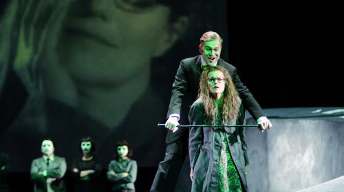 Es ist nicht einfach, innerhalb von 70 Minuten Identifikation und Nähe zur Protagonistin zu schaffen. Regisseur Horres lässt in den Schlüsselszenen Nahaufnahmen von ihrem Gesicht auf den Bühnenhintergrund projizieren. Das Ergebnis ist zweischneidig, denn Dagmar Hesse, die die Selma mit Tiefe und Dramatik singt, wandelt mit großer Hornbrille, die ihre Augen stark vergrößern, auf einem schmalen Grat zur Karikatur. Ansonsten bleibt die Bühnenhandlung stark eingeschränkt. Ausstatter Jan Bammes stellt einen teilbaren, halb offenen und geneigten Ring auf die schwarze, leere Bühne. Darin und darauf agieren die fünf Haupt- und fünf Nebendarsteller, transportieren die Handlung allerdings überwiegend über die – englischen, deutsch übertitelten – Texte.