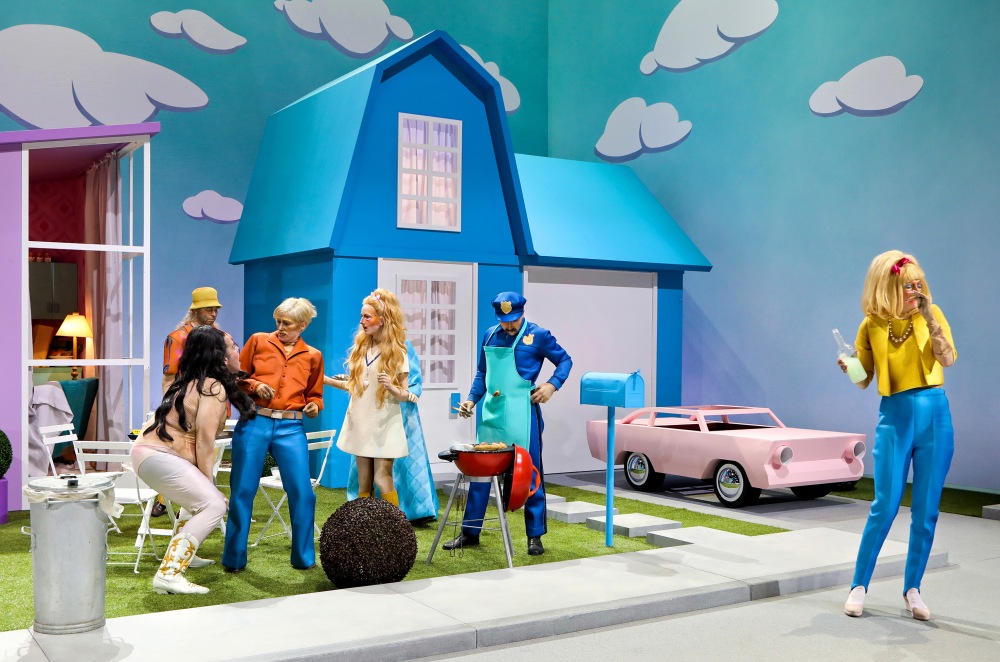 Sie hocken in ihrer suburbanen Hölle, die Pizzakartons türmen sich, der Alk fließt und für eine neue Line ist immer Zeit. Phaedra (Benny Claessens) vertreibt sich mit ihrer Freundin Peggy beziehungsweise Oenone (Lola Klamroth) die Zeit, während ihr Mann Theseus den Vietcong massakriert. Was sollen sie auch machen, diese „Vorstadtweiber“ in ihren knallbunten Eigenheimen mit PKW-Stellplatz für lustige Tretautos. Der Himmel strahlt knatschblau und ist mit Wölkchen übersät, und zwischen ihnen hängt eine Sprechblase, auf die das Innenleben der Häuser projiziert wird. Eine Welt, die sich selbst als ihr eigener Comic-Mythos inszeniert.