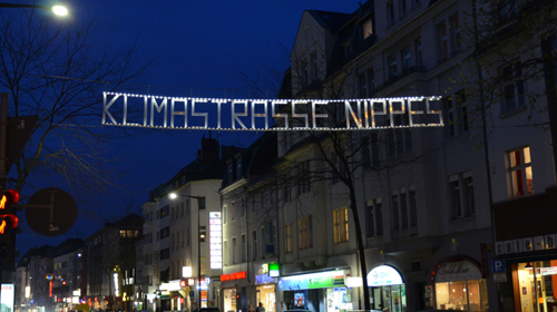 „Klimastraße“ – das ist doch mal eine Begrüßung. Den Schriftzug bilden etliche 0,1-Watt LED-Leuchten am Eingang der Neusser Straße an der Abzweigung Kempener Straße in Nippes. Seit knapp einem Jahr wurde das profane „Einkaufstraße Nippes“-Leuchtbanner gegen die „Klimastraße“ ausgetauscht, die im weiteren Verlauf bis zum Niehler Kirchweg reicht. Die Kosten für den jährlichen Betrieb des Leuchtbanners haben sich seit dem Austausch von 800 auf 100 Euro verringert. Fragt man aber Passanten auf der Straße, was die Klimastraße sein soll, erntet man allenthalben Schulterzucken.