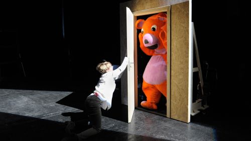 Wenn sie nicht gerade anonymen Kaufhaustoilettensex hat, im Fitnessstudio bis zur Ohnmacht trainiert oder bulimisch Essen auskotzt, ist Helene, von Katharina Schmalenberg mit einem beeindruckend kämpferischen Wahnsinn gespielt, in der Klinik. Sie ist die fleischgewordene Krise. Und auch Helenes Mann Martin, ein kulturpessimistischer Autor, ist krisengebeutelt. Benjamin Höppner keift diffus verzweifelt gegen den unsichtbaren Gegner „Krise“ an und man meint Albinus selbst zu hören, der die Figuren in seinem politisch unkorrekten Stück gegen das System anrennen lässt – ähnlich wie in Lars von Triers Dogma-Film „Idioten“, in dem Albinus selbst mitgespeilt hat. Und tatsächlich gelingt Helene der Ausbruch. Zwei riesige Holzwände öffnen sich für Helenes Psycho-Odyssee.