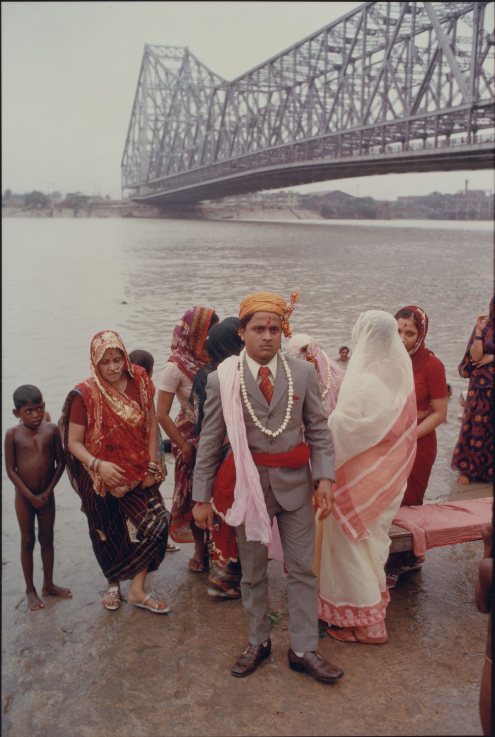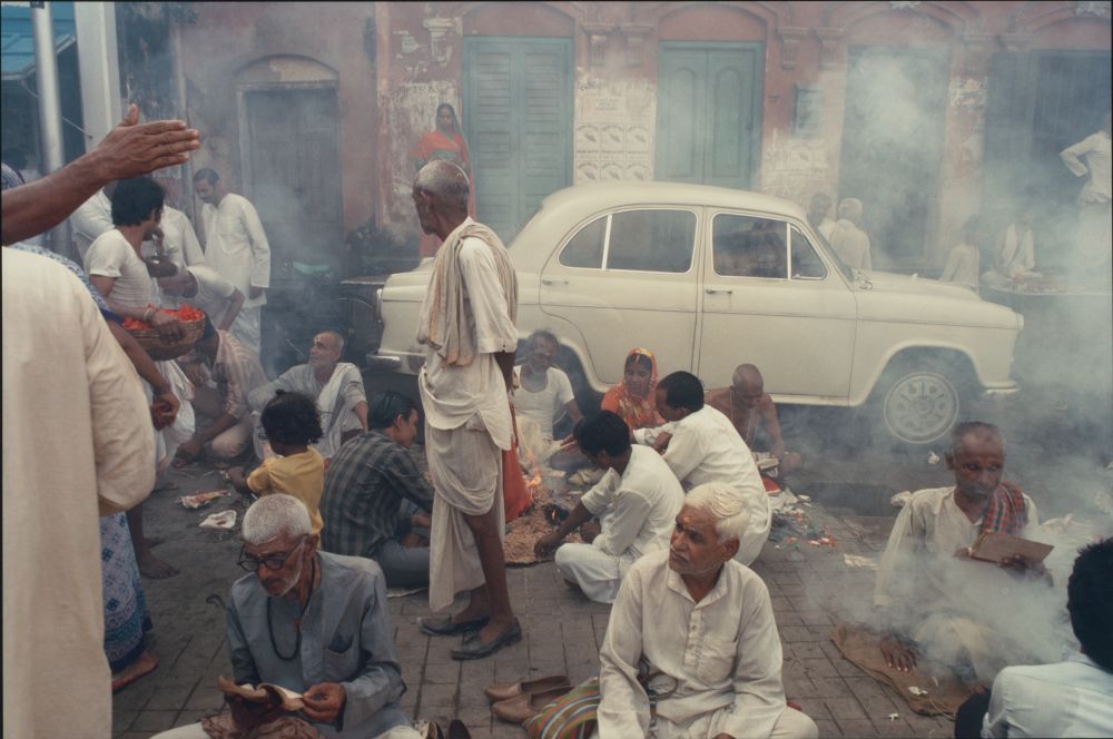 Raghubir Singh wendet sich dem pulsierenden Geschehen auf der Straße zu, sucht aber auch stille Orte auf. Er zeigt den Handel vor der Börse und weist subtil auf die Spuren des Wahlkampfs, die sich an Hauswänden manifestieren. Vereinzelt tritt er in Häuser ein und tastet so mit der Wirkung von Licht und Schatten, Raumflucht und versperrender Wand ein Musikzimmer ab, das mit Porträts geschmückt ist und eine Hommage an Rabindranath Tagore und die bengalische Renaissance enthält. Auch erweist er sich als großartiger Porträtist, der von nahem sein Gegenüber – den Filmregisseur Satyajit Ray – fotografiert. Auf dem einzigen Hochformat der Ausstellung hat er einen Bräutigam mit seiner Gesellschaft gestaffelt am Fluss Hugli aufgenommen, darüber zieht sich das Stahlgerüst der berühmten Howrah-Brücke in die Tiefe. Immer wieder findet sich ein plötzliches Aufeinanderprallen des „alten“ Indien mit der „neuen“ Gegenwart. Gläubige feiern das Puja-Fest und im Hintergrund fährt ein weißes Auto durch die Szenerie. Einmal ragt ein Arm in das Bild hinein, in einem anderen Bild ist ein Rolls Royce im Vordergrund angeschnitten. Dazu türmt sich das Geschehen im Format auf, betont noch durch trennende Bildachsen.