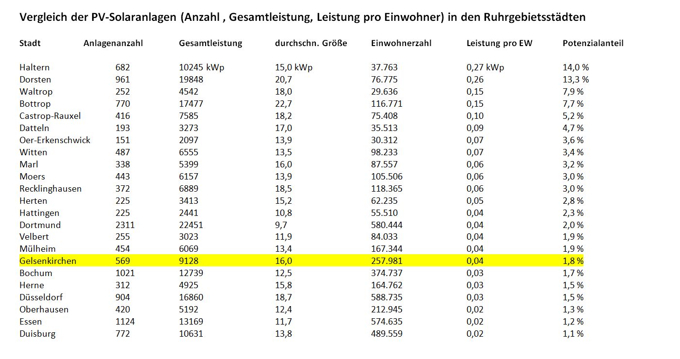 „trailer Ruhr“ hat 22 Städte des engeren Ruhrgebiets sowie die Landeshauptstadt Düsseldorf miteinander verglichen. In diesem Ranking wird jede Kommune mit der realen Solarstrom-Leistung pro Einwohner/in bewertet, ferner mit der bisherigen Ausnutzung ihrer Chancen. Tabellenführer ist eine ländliche Randgemeinde: Haltern am See. Dort weist man jedem Bürger 270 Solar-Watt zu und hat die Möglichkeiten immerhin zu 14 Prozent genutzt. Die „rote Laterne“ hält Duisburg mit 20 Watt und 1,1 % Potenzialausbeute. In der „ersten Liga“ findet sich mit der „Innovation City“ Bottrop (Platz 4) lediglich eine Großstadt, es folgen Dortmund (14.), Mülheim (16.), Gelsenkirchen (17.), Bochum (18.), Herne (19.), Oberhausen (21.) und Essen (22.). Die betuchte Landeshauptstadt Düsseldorf kommt nicht über Platz 20 hinaus.