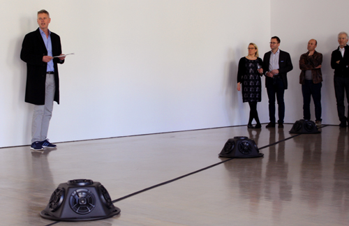 „So viel Aufwand haben wir noch nie betrieben!“ Mit diesem Satz begrüßt Galerist Thomas Zander das Publikum zur Vernissage. Damit bezieht er sich auf den Aufbau der Sound-Installation „Travelling Wave“ von Anthony McCall (*1946), die im oberen Stockwerk der Galerie zu sehen beziehungsweise zu hören ist. Von außen sieht es beinahe so aus, als würde im oben gar nichts ausgestellt werden. Auf dem Boden stehen lediglich fünf halbkugelförmige Lautsprecher, die diagonal in einer Linie im Raum angeordnet sind. Erst bei Betreten des Raumes leuchtet die Rolle der Lautsprecher ein. Sie sind darauf ausgelegt, eine maximale akustische Verbreitung zu gewährleisten, um den Zuhörer in ein einzigartiges Sounderlebnis eintauchen zu lassen.