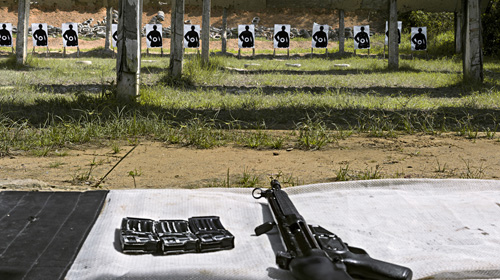 Und es macht schon nachdenklich, wenn man diese zahllosen unterschiedlichen Ziele erforscht. Hier ein grünes Männchen (Iwan), dort gar eine vollbusige Amazone (Libanon), die Schützen schießen und sie treffen augenscheinlich auch Dinge, die ihnen auf der Metaebene Feinde suggerieren, die sie vielleicht nie erwartet und über die sie nie nachgedacht haben. Seit die Kriege asymmetrisch wurden, soll heißen, dass den Soldaten die Schlachtfelder ausgegangen sind und dass die bewaffneten Auseinandersetzungen jetzt grundsätzlich überall ausgetragen werden, hat sich wohl auch die Philosophie der „targets" gewandelt. Parcours im Häuserwald, dunkle Verließe sind zu sehen, oft Pappkameraden mit Geißeln, die natürlich „unverletzt" bleiben sollen. Manche von den Stellagen fallen tatsächlich um, andere werden nur regelrecht zersiebt, der Kostendruck macht auch hier wohl nicht halt, auch Frauen sind beim weltweiten Zielschießen immer präsent, sowohl vor als auch hinter der Waffe.