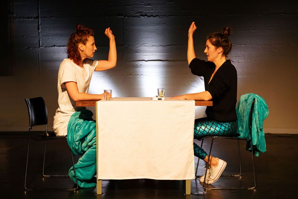 Mit Brötchen beginnt es, beim Tod endet es. Thelma und Louise oder Selma und Luise (Franziska Schmitz, Anna Möbus) sind Schwestern und treffen sich zum Frühstück in der Küche – Thelma hat aber die Brötchen vergessen und schon ist der Streit da. Klassischer Geschwister-Streit mit vertrauten Tiefschlägen und Versöhnungsangeboten. Ironie und Komik als Mittel der Distanzierung auf der einen Seite, vermeintliche Autorität der älteren Schwester auf der anderen. Wer mit Geschwistern aufgewachsen ist, kennt das Setting, in dem ein frühkindlich eingeübter Stellungskrieg mit vorhersehbarer Rollenverteilung immer wieder ausgefochten wird. Doch Andrea Bleikamps sehenswerter Schwestern-Pas-de-deux stellt nur den Auftakt für ein viel abgründigeres Spiel dar.