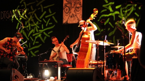 Völlige Dunkelheit umhüllt einen. Leise kann man ein langsames Reiben, ein Rauschen vernehmen. Das Rauschen verdichtet sich zu einem lauten Summen. Allmählich gehen die Lichter an und der Ursprung der seltsam anmutenden Geräusche ist auszumachen. Zu erkennen sind die Musiker von Public Harmony, der ersten Gruppe dieses Abends. Die drei fangen jedoch gerade erst an… Das Brummen wird immer lauter und bedrohlicher, bis es wieder zum kaum merklichen Schnarchen verstummt. Die Musiker arbeiten sich dabei auf der Bühne ab: Sie pusten, kratzen, drücken an Hebeln oder zweckentfremden Gegenstände wie eine Kette, womit sie ihren Instrumenten ungeahnte Klänge entlocken. Sie scheinen die Töne zu ‚fühlen‘ – mit geschlossenen Augen geben sie sich völlig ekstatisch ihrem Spiel hin.