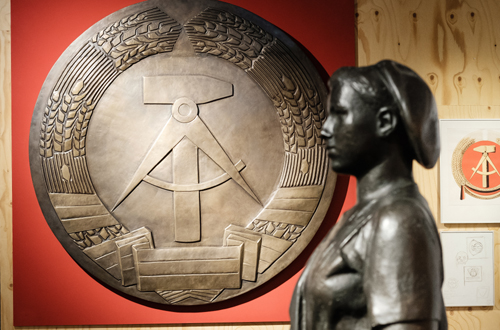 Gleich nach der „eigentlichen“ bundesrepublikanischen Staatsgründung im Berner Wankdorf-Stadion wandert die Bonner Schau in die Gründungsmythen der DDR, stramm antiimperialistisch, natürlich einzig antifaschistisch und wie von selbst sowjetkommunistisch (hier ein Honecker-Zitat, dort Gucklöcher ins sozialistische Sowjet-Elend in Wilnsdorf und Karlshorst). Weiter marschieren die Parolen: Das Vermächtnis an den Widerstand im Dritten Reich „lebt in unserer Tat“. Dazu die „Traktoristin“ in Bronze von Walter Arnold, Schlagwort: Junkerland in Bauernhand! Auch nur ein Mythos: Denn schon kurz nach 1989 hatte sich das wieder erledigt: Die „blühenden Landschaften“ - auch dieses Kohl-Zitat ist natürlich Bestandteil der gesamtdeutschen Erinnerungskultur – sind längst in Wessi-Hand und blieben so Teil einer mythischen Zukunftsvision.
