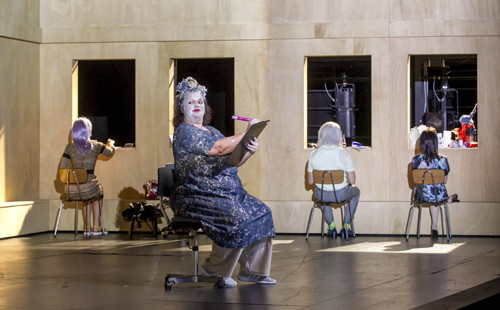 Die junge Regisseurin spannt vor der Straßenfassade mit hohlen Fensteröffnungen (Bühnenbild: Anne Ehrlich) allerdings einen weit größeren Referenzrahmen auf. Ihre Heldin ist eine Art Idiotin im dostojewskischen Sinne, eine Fürstin Myschkina, die gutgläubig durch die Republik gondelt und auf ein Pandämonium trifft: ihre Familie, in der sich die Altersstufen verkehrt haben und Exhibitionismus am Kaffeetisch alltäglich ist. Ihr früherer Geliebter Paul, der als Hypermotoriker seinen Stillstand beklagt. Zugleich betont Rupprecht Lottes religiöse Selbstbeschreibung, sie sei eine der 36 Gerechten. Faszinierend die Szene „Stationen“ in der Lotte sich durch eine Gegensprechanlage klingelt. Zu einer Stimmenkakophonie gesellen sich ein Paar mit Totenmasken, und schließlich überzieht sich die Wand mit Schreckensfratzen à la Hieronymus Bosch. Lottes Gottes-Dialog „Falsch verbunden“ spricht deshalb weniger von emotionaler Kälte, als einer metaphysischen Orientierungslosigkeit, die einhergeht mit der Implosion der sprachlichen Bedeutungssysteme. Weshalb Sprache und Hören, das macht Rupprecht immer wieder deutlich, weit mehr bedeuten als nur Kommunikation.