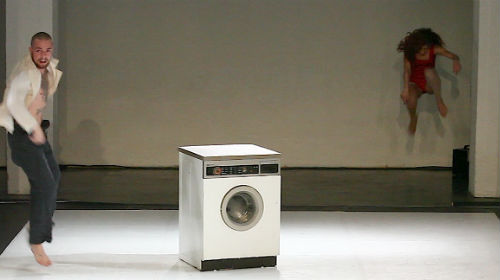 Zum drängenden Sound der großartig aufspielenden Cellistin Jacqueline Hamelink prallt ein Paar mit wuchtigem Körpereinsatz aufeinander. Die Vorstellung von Lucie Petrusová und Joss Carter im Duett „T.+Bernadette“ überschreitet die Grenze vom Tanz zur Performance. Zwischen Waschmaschine und Cello begegnen sich ihr schlanker, kindlicher Körper und seine breite, über und über tätowierte Brust so vehement, dass man Angst vor Verletzungen haben muss. Männlicher Zorn begegnet einer geschmeidigen weiblichen Präsenz, die aggressive Energie wie selbstverständlich aufzulösen scheint. Mit einer inhaltlichen Motivation für dieses glühend getanzte Duett hält sich Kristel van Issum ebenso wenig auf, wie in der Solo-Choreographie „Girl29“. Auch hier gibt die Musik das Tempo mit der Stimme von Georgi Sztojanov vor, der über Gesang und Sprache die Performerin Tegest Pecht-Guido zum Tanz animiert. Die Klänge versetzen den Körper der kleinen, spannungsgeladenen Tänzerin in konvulsive Bewegungen. Kristel van Issums Tänzer wirken mitunter, als seien ihre Körper an einen Stromkreis angeschlossen.