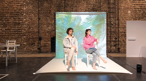 Auf dem Sofa liegt Alejandro Russo und blättert im trailer Magazin. Liliana Ferri De Guyenro kommt nach Hause, schlüpft in Glitzersocken von den Turnschuhen in die Hausschuhe, sagt kurz „Hi“ und wäscht sich die Hände. Bücher wie „Der schön gedeckte Tisch“ verraten, dass es hier um den äußeren Schein geht. Dieser Raum wirkt wie ein Warteraum. Ein Raum, in dem es eigentlich nichts zu tun gibt. Die beiden rücken Möbel, wollen Kaffee, haben aber keinen mehr und die Warteschleife sagt, dass die aktuelle Wartezeit noch fünfzig Minuten beträgt. Der Tanz durchbricht die Warteraum-Atmosphäre. Sie vollführen Bewegungen die emotional geladen sein könnten, Kniefälle, ein forderndes Ausstrecken der Arme, doch sie tun dies distanziert, mit kühlem Blick und ändern immer wieder den Kontext der Bewegung.