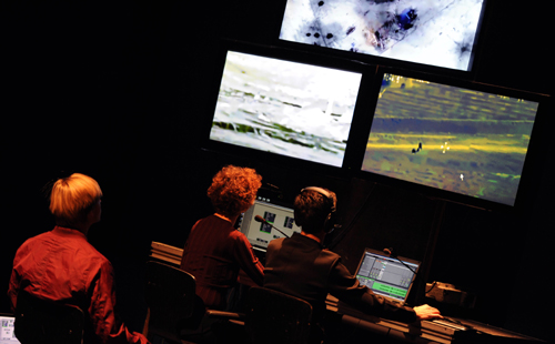 „Drones“ heißt das neue Stück des fringe ensembles. Es ist Musiktheaterprojekt des Kölner Komponisten Gregor Schwellenbach, das im Rückbezug auf die geräuschhafte und minimalistische Drone Music des Komponisten La Monte Young den Text „Autopilot“ von Lothar Kittstein mit der Drohnendebatte des Bundestags zu einer „Oper“ vertont. Die drei Performer wechseln zwischen den Monitoren und dem um die Zuschauer positionierten Instrumentenpool (Orgel, Keyboards, Gitarren) und entlocken ihnen Klangflächen ohne Melodie und Rhythmus, irgendwo zwischen Fluggeräusch und Klangteppich. In einer Art syllabischem Sprechgesang ertönt Kittsteins Text über einen Mann, der eine Drohne aus seinem Büro steuert. Er schwärmt von der Natur, dem detaillierten Blick auf Menschen und Dinge, schließlich glaubt er sogar Gerüche wahrzunehmen. Es sind Beobachtungen aus einer Perspektive der Einsamkeit und Imagination, des Voyeurismus und der Allmacht, die sich zur Zerstörung autorisiert fühlt. Dieser Blick und das Aussparen jedes Spektakels an Explosion und Lautstärke eröffnet die Möglichkeit zur Identifikation und schafft so ein Klima der Irritation. Die Ästhetisierung des Schreckens ist total. So schön kann Vernichtung sein. Die meditative Stille der Klangflächen verdoppelt diese Wirkung noch. Wenn dann selbst die Stimmen der Bundestagsabgeordneten gesanglich manipuliert werden, ist die Absurdität perfekt.