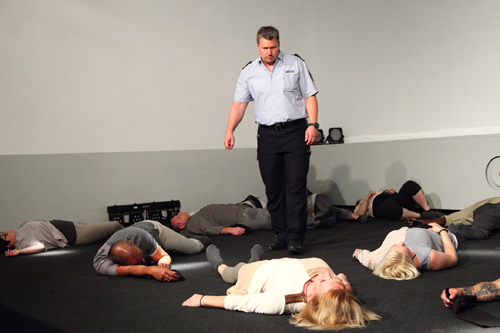 Eins steht fest: Für den Besucher gibt es kein Entkommen. Gleichzeitig wird er an diesem Abend zum Spiegelbild der Gesellschaft, denn – das ist das Traurige – außer zu anderen Insassen und JVA-Beamten haben diese Menschen wenig menschlichen Kontakt. „Die Würde des Menschen ist unantastbar“, sagt nun ein etwas dem Klischee widersprechender JVA-Beamter, der das Projekt mit ermöglicht hat. Scheinbar richtet er diesen Satz an alle Beteiligten. Es folgt eine in den Bann ziehende Performance, die sich um die Fragestellungen „Vergangenheit, Zukunft, Zeit, Schuld, Vorurteile und Stigma“ dreht. Neben Ernst sind dabei aber auch kleine Witze erlaubt. So schreit plötzlich ein auf der Erde liegender JVA-Insasse: „Hilfe – ich bin ein Star, holt mich hier raus!“, was Lacher hervorruft.