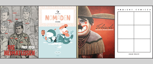 Auch Rotopol Press ist ein verdienstvoller Kleinverlag, der Experimente wagt. Dort erscheinen neben narrativen Werken auch Leporellos, Postkarten, Skizzenhefte u.Ä. Zuletzt erschien hier der zweite Band der „Ambient-Comics“ von Nadine Redlich. Hier kann man in aller Ruhe beobachten, wie sich die Zeit in eine Comicerzählung einschreibt. Redlich stellt in jeweils sechs Bildern pro Seite Bartwuchs, den Bau eines Spinnennetzes oder einen vorüber fahrenden Zug dar. Das Ergebnis ist nicht nur ebenso beruhigend für die Seele wie die Namen gebende Ambient-Music, es ist auch um ein vielfaches komischer. Kein Wunder, dass Nicolas Mahler das Vorwort für den ersten Band geschrieben hat: Das ist reinster Minimalismus mit maximalem Effekt (Rotopol Press).