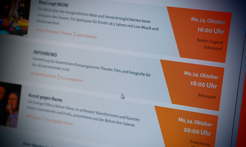 Je nach Vorliebe können hier Filter wie „Erwachsenentheater“, „Kinder- und Jugendtheater“, „Schauspiel“, „Performance“ oder „Tanz“ usw. über das Programm gelegt und damit einzelne Veranstaltungen, die den eigenen Interessen besonders entsprechen, herausgefiltert werden. Die Einpflegung von Inhalten zu den Theatern erfolgt aktuell über eine Redaktion, welche die Handhabung für die Theatermacher im Moment noch etwas schwerfällig macht. Den Spielplan kann jede Theatergruppe und jedes Theaterhaus selber mit eigenen Spielterminen füllen, hier fehlt es allerdings an Möglichkeiten, Veranstaltungen, die nicht in klassischen Theaterräumen oder an alternativen Spielstätten stattfinden, ebenfalls einzupflegen. Kinderkrankheiten, die sicher bald behoben sein werden. Insgesamt stellt die neue Seite eine große Verbesserung gegenüber der bisherigen theaterszene-koeln.de-Seite hinsichtlich ihrer Übersichtlichkeit und auch der Benutzerfreundlichkeit für normale Theaterbesucher dar. Man kann dem Projekt also nur dauerhaften Erfolg wünschen und jeden ermutigen, die neue Homepage zu nutzen, um sich einen umfassenden Überblick über die Aktivitäten der Kölner Theater zu verschaffen.