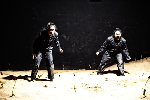 Der Kölner Regisseur und Dramaturg Tim Mrosek hatte 2017 auf der kleinen Bühne des Orangerie-Theaters Shakespeares blutrünstiges Drama „Titus Andronicus“ von 14 auf 5 Schauspieler sehr eindrucksvoll eingedampft. Auf der Studiobühne, ehemalige Mensa der Universität, ging es jetzt – man durfte gespannt sein – von 11 auf nur 2 zurück im „Sturm“, nicht von, sondern nur „nach“ Shakespeare, seinem letzten Stück. Selbst der Artikel im Titel wurde wegrationalisiert. Zu Recht, hat doch Mrosek, unterstützt von den Dramaturgen Martin Wiesenhöfer und Katja Winke, ganze Arbeit geleistet mit einer partiellen Versetzung in die Jetztzeit, mit ständigem Tausch der Charaktere, mit stürmisch-harter Rockmusik, mit wilden Kampfszenen und mit 7,5 Tonnen Lkw-Ladungen an Sand auf der sonst nackten schwarzen Bühne von Jasper Diekamp. Dort flackert „Hell is empty and all the devils are here“. Zuckende schwarze Gestalten, offensichtlich Schiffbrüchige nach einem Sturm (kein Wunder bei dem Krach), quälen sich auf der mit einzelnen Blümchen karg bewachsenen Insel an die Rampe, schreien tonlos und kämpfen gefühlte fünf Minuten bis zur Erschöpfung. Sind wir in einem modernen Ballett gelandet? Mitnichten; der gleichzeitige und sehr minuziöse Monolog beider fordert eine Gesellschaftsutopie, ein ideales Leben ohne Krieg und ohne Arbeit.