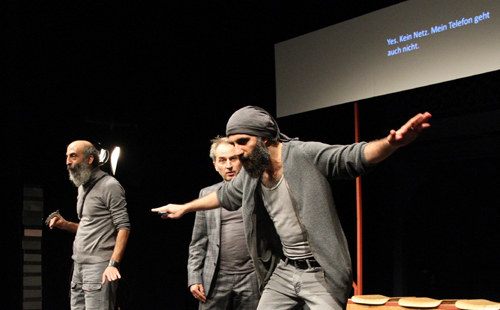 Das sieht bei „Zwischenhalt“ von Mirzas Metin anders aus. Zwar hätte am Ende ein beherzter Strich dem Stück gutgetan, aber der an Beckett und Pinter erinnernde Plot von drei Männern (Ilker Abay, David Fischer, Mirza Metin), die an einer Bushaltestelle warten, hat eine deutliche symbolische Aufladung. Der eine will flüchten, der andere will Tänzer werden, muss aber als Kellner arbeiten und hat aufgeplatzte Schuhe, der dritte will einfach nur nach Hause nach Deutschland. Der Abend schwankt zwischen Absurdität, Komik und Abgründigkeit und verfügt über reichlich politische Anspielungen wie einen aufziehenden Sturm oder einem angedeuteten Serienmörder. Dass der Bus am Ende nur einen oder zwei Plätze bereithält, ruft sogar Mordgelüste hervor. Es gelingt offenbar doch, in der türkischen Diktatur Theater zu machen.