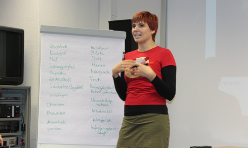 Im weiteren Verlauf analysierte die Journalistin die Gewichtung von männlichen und weiblichen Protagonisten genauer. Dabei zeigte sich, dass selbst im Kinderfernsehen überwiegend männliche Rollenmodelle vorkommen, auch bei Fantasiefiguren („Sesamstraße“) sind diese in den seltensten Fällen weiblich. Da Mädchen in den Medien nicht entsprechend porträtiert würden, hätten sie auch deutlich geringere Entfaltungsmöglichkeiten als ihre männlichen Altersgenossen, ergänzte Rieger. Diese Tendenzen zeigen sich in ähnlicher Form auch in Medieninhalten für Erwachsene, da in zahlreichen westlichen Mainstreamfilmen der Anteil der Dialogzeilen von Frauen stark hinter dem von Männern zurückbleibt und Frauen häufig durch den „male gaze“ inszeniert werden, den männlichen Blick, der in ihnen lediglich Sexualobjekte sieht. In ihrem rund vierstündigen Workshop fand Sophie Charlotte Rieger auch noch Zeit, Spezialfälle vorzustellen. Unter „niedlicher Misogynie“ beispielsweise versteht man das sexistische, frauenfeindliche Verhalten von Filmfiguren (hier am Beispiel von Charakteren aus „The Big Bang Theory“ visualisiert), das durch deren allgemein als niedlich klassifiziertem Auftreten gerechtfertigt wird und der Unterhaltung dient. Zum Abschluss ließ die Referentin die TeilnehmerInnen noch selbst einen Test für sich entwickeln, mit dem diese sicherstellen können, bei ihren künftigen Arbeiten auf unbewusste Kategorisierungen zu verzichten.