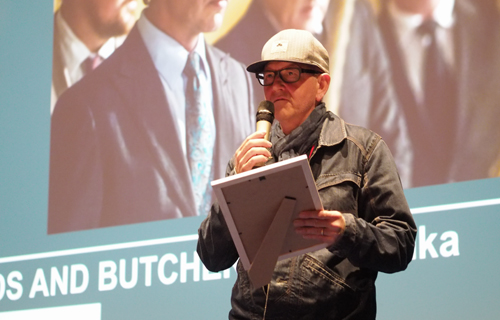 „Ich dachte, ich komm mal vorbei am Schluss, guck mal, was passiert. Vielen, vielen, vielen Dank. Der Film wurde mit viel Leidenschaft gemacht, war auch kein einfaches Projekt wegen der Perspektive. Wenn ein junger weißer Mensch, der Täter ist, irgendwie auch Opfer... eine ganz schwierige Geschichte zu erzählen, aus der Apartheidszeit. Ich bin total gerührt und will mich von ganzem Herzen bedanken, auch beim Festival, wo die meisten meiner Filme gelaufen sind. Ich finde es klasse, hier hinzukommen und auch so ein Publikum zu haben, wo so viele wichtige Sachen wie auch die Verbindung zwischen Afrika und Deutschland besprochen werden, wie [vor der Preisverleihung] in dem Film [„Skulls of My People“] von Vincent Molloi.“