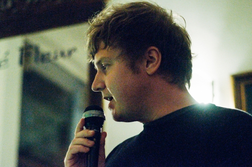 Die ernst gewordenen Gesichter entspannten sich sogleich wieder als Neu-Kölner Martin Becker (*1982), der das Schlusslicht des Abends bildete, souverän die Titelgeschichte seines in Kürze erscheinenden fünften Romans „Warten auf Kafka. Eine literarische Seelenkunde Tschechiens“ las. Der neue Roman des bereits erfahrenen Autors, Kritikers und Regisseurs ist inspiriert von der eigenen Liebe zu Prag. Es war leicht sich in den Sehnsüchten und Träumereien des Protagonisten wiederzufinden: die hoffnungsvollen Gedanken, die in einer osteuropäischen Großstadt entstehen, das unermüdliche Warten auf die ganz große Wendung des Schicksals. Das alles durchzogen von spritzigen Dialogen und humorvollen Satzneufindungen („Unter dem Wirt sind alle gleich“).