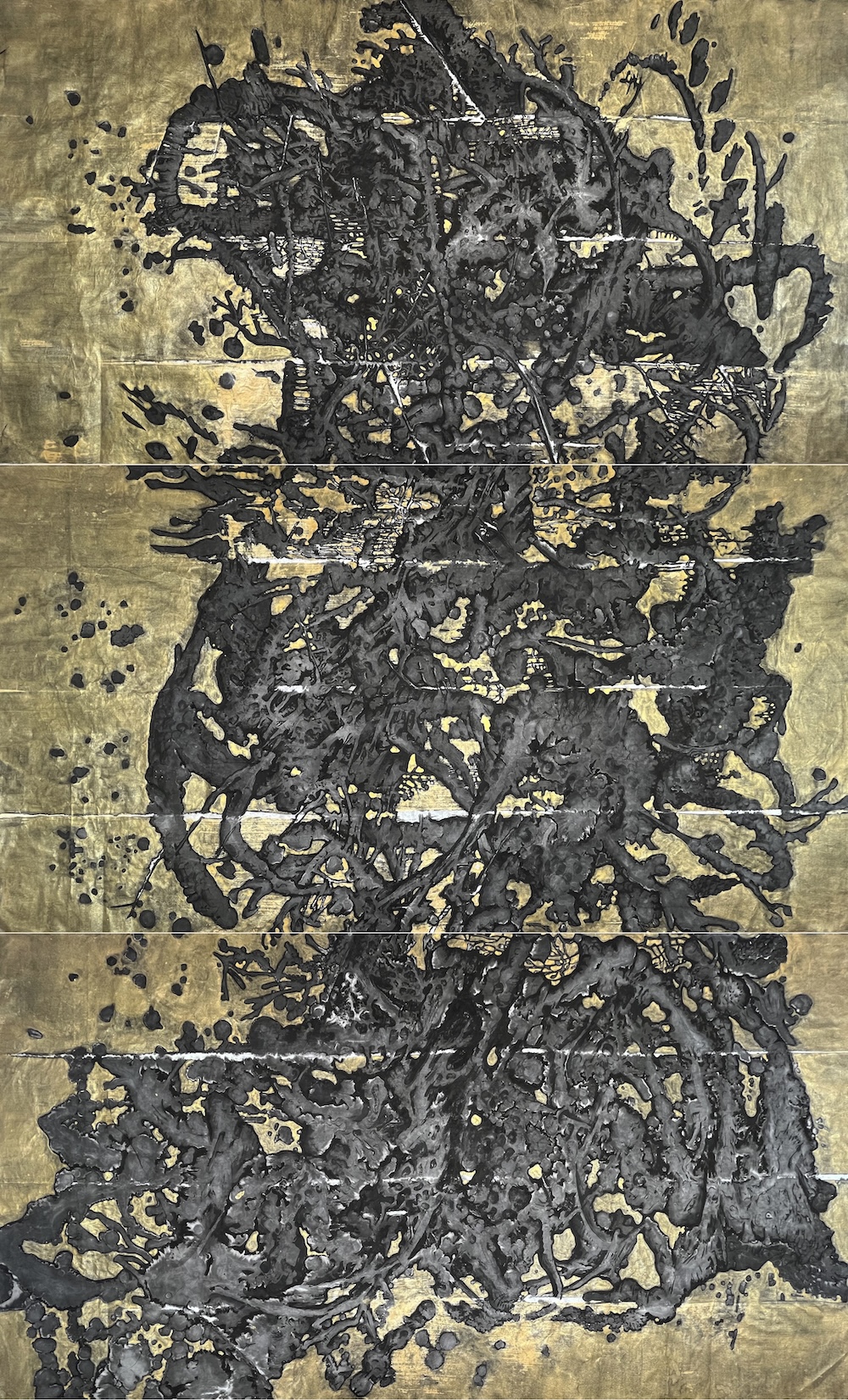 Der Rundgang beginnt mit einer monumentalen Tuschzeichnung von Jianfeng Pan (*1973), in der sich eine Figur andeutet, die er auch als (mentales) Selbstporträt versteht. Entstanden ist sie in einer Mal-Performance unter engagiertem Körpereinsatz am Eröffnungsabend, die auf einem Monitor aufgezeichnet ist. Daneben findet er zu weiteren Ausdrucksformen, ist überhaupt vielseitig. Ausgestellt sind mehrteilige Hängerollen, die im Changieren des aquarellartigen schwarz-grauen Gestus landschaftliche Anmutung, Naturerfahrung und geistige Verfassung verschmelzen. Ähnlich spektakulär wirkt die langgestreckte Darstellung eines Faltbuches in Vitrinen. Sie zeigt eine dynamische farbige Fantasielandschaft, in die Kreaturen verwoben sind und seine visuelle Variabilität als Grafikdesigner vermitteln.