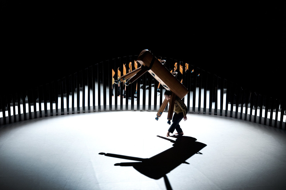 Hin und wieder klingen hohen Töne in den Ohren, während Tänzerin Mijin Kim eine Reihe schmaler Spiegelstreifen entlangläuft, die eine vielfach gebrochene Bewegung zurückwerfen, und nie das Bild eines einzelnen Körpers. Nach einigen Minuten der Beschäftigung mit der Spiegelung oder eben Nicht-Spiegelung, wird Kims Partner auf die Bühne gezogen, steif und schwer in der Seilschlinge: Ein kiloschweres Pauschenpferd – ein lederbezogenes Turngerät auf vier Beinen, das bei weniger sportlich Begabten unangenehme Erinnerungen an die Schule hervorruft. Spätestens als das Pferd in die Höhe gezogen wird, um diagonal über der Bühne zu baumeln, verliert sich die Assoziation. Ohne stabilisierenden Boden unter den Füßen wird das Pauschenpferd, kreisförmig pendelnd, in seiner massigen Wucht erfahrbar. Während der folgenden halben Stunde tritt die menschliche Tänzerin in Beziehung zu diesem unbelebten und trotzdem schwingenden Objekt.