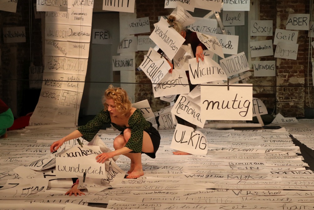 Jede Menge Tanzbilder entstanden dabei in den Kölner Ehrenfeldstudios. Hier kann man sehen, wie einem jemand um den Hals hängt, oder wie es sich anfühlt, wenn Übergriffe stattfinden. Die Sprache des Tanzes ist unmittelbar und sinnlich. Aber sie kann auch hinüber in die Abstraktion wechseln. Das geschieht im Verlauf der Inszenierung so massiv, dass am Schluss die Bühne voller Worte ist. Mit Worten lässt sich subtil ausgrenzen, dieses Thema spielt das Ensemble mit Hingabe aus. Die Mechanismen der Diskriminierung werden entlarvt, bei denen es eben nicht um Argumente, sondern um Verleumdung geht. Eine faszinierende Demonstration gelingt den Metabolisten, indem sie uns zeigen, wie wir mit dem Körper verstehen.