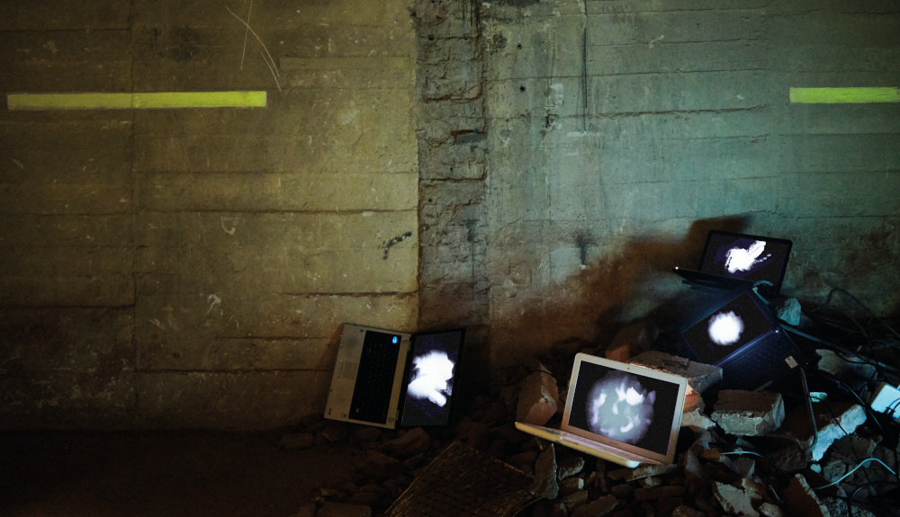 Bei der E-Waste-Installation im Bunker ginge es auch darum, so der Kölner Sound and Media-Artist Roman Jungblut, auf das Thema der Nachhaltigkeit aufmerksam zu machen. Grundelement der Gestaltung sind Animationen, die auf alten Laptops, Tablets und Smartphones abgespielt werden. Geräte, die in ihrer ursprünglichen Verwendungsabsicht nicht mehr genutzt werden (können), bekommen so einen neuen Sinn. Die Videos erinnern an Zellteilung, an Informationsübertragung zwischen Computerchips, der Gesamteindruck an ein vergessenes Großraumbüro im Weltall. Schon bei der Konzeption war den beiden Künstlern Roman Jungblut und Claus Daniel Hermann klar, dass die Installation nur in einem Bunker stattfinden könne. Das seien schließlich ebenfalls Orte, die in ihrer ursprünglichen Absicht nicht mehr genutzt werden. Und die nun entweder zerfallen, abgerissen oder mit neuen Ideen gefüllt werden.