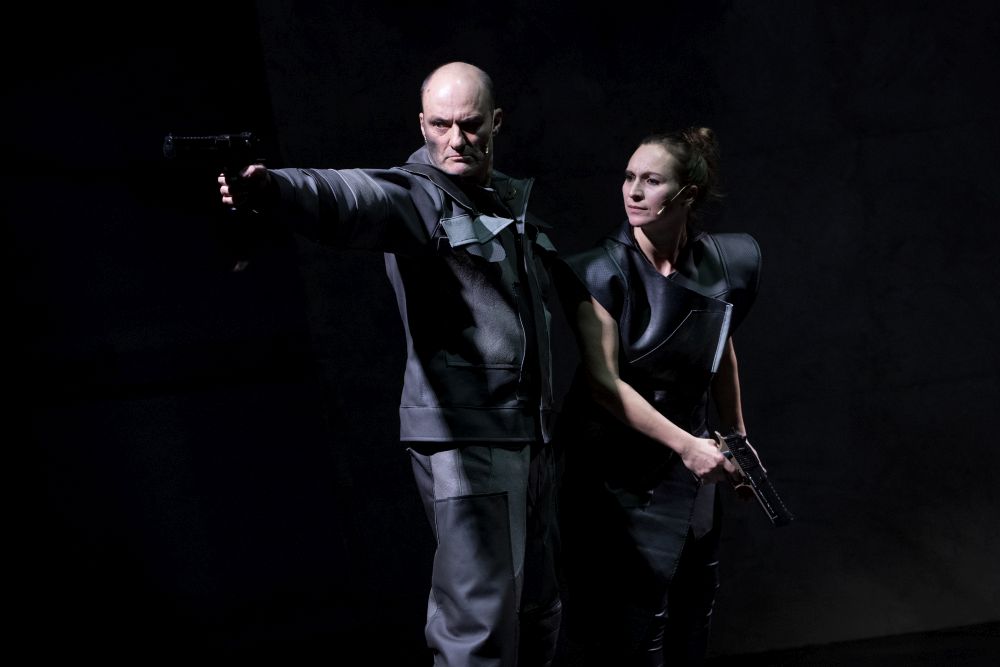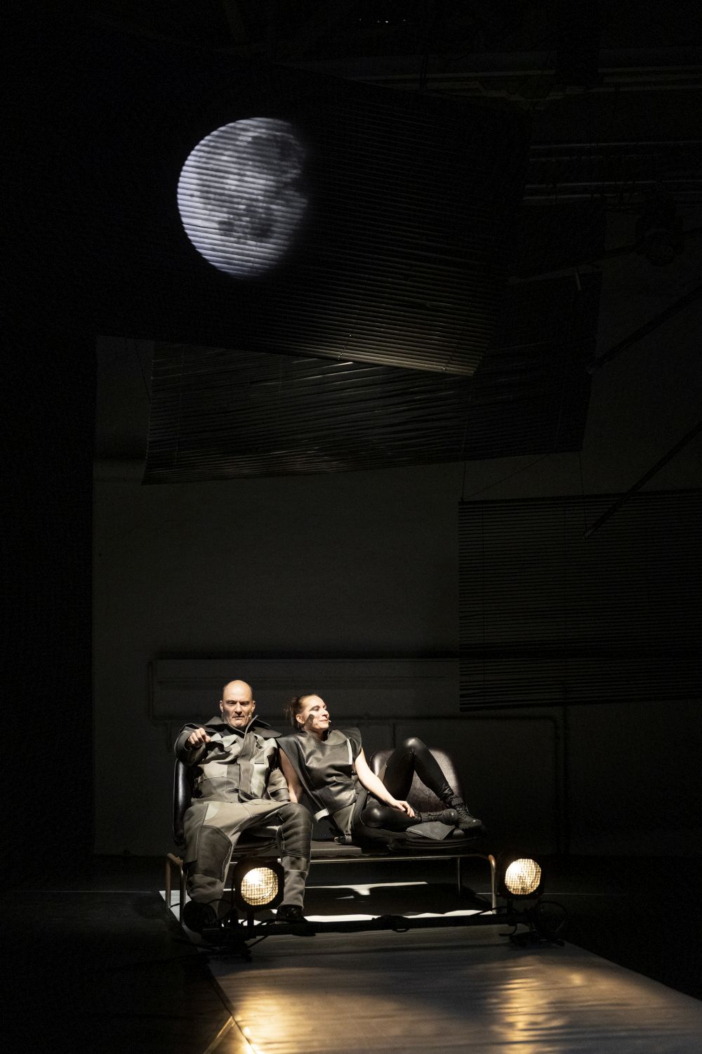 Eigentlich gibt es sowieso kein Entrinnen aus dem Plot. Luz hat Tamers Vermieter die Treppe runtergestoßen, was den Tod des Miethais zur Folge hat. In dessen Auto finden die beiden Flüchtenden dann eine Knarre, mit der sie auf Abenteuerfahrt gehen. Ein klassischer Filmtopos, dessen Bonnie & Clyde-Dramaturgie felsenfest gemauert ist. Doch Tamer und Luz sind als Spielfiguren angelegt: Sie tragen futuristisch anmutende graue Kostüme mit ausgestellten Schulterpartien, ihre Aktionen zerfallen in einen dialogischen Part und in einen roboterhaften, in dem sie wie ferngesteuert über die Bühne laufen. Die beiden agieren also einmal als handlungsmächtige Subjekte des bürgerlichen Theaters und zugleich als (allzu übertrieben künstliche) Gamefiguren. Wie programmiert ist ein bürgerliches Schicksal? Wie selbstbestimmt das Schicksal eines Avatars? Oder ist Leben sowieso ein partizipativer Prozess?
