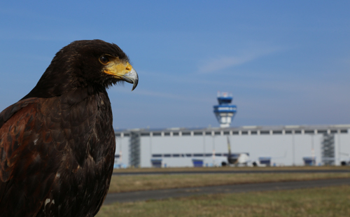 Um Greifvögel fernzuhalten, müssen Muuß und seine Mitarbeiter indirekt vorgehen und bedienen sich dabei der Hilfe von ungewöhnlichen tierischen Verbündeten – nämlich Frettchen. „Greifvögel werden in erster Linie von den Kaninchen angezogen, die auf dem Gelände leben”, erklärt Muuß. „Darum bejagen wir sie und bringen sie, wenn möglich, lebend an einen anderen Ort.” Bei den Jagden werden die Frettchen im Herbst und Winter dafür eingesetzt, die unerwünschten Nager aus ihren Bauen zu jagen. „Sobald Kaninchen die Frettchen in ihren Bauen riechen, nehmen sie Reißaus”, weiß Muuß. Die Frettchen leben das ganze Jahr über auf dem Flughafengelände, in einem eigenen Stall mit großzügigem Außengehege. Zweimal in der Woche greift die Bird Control auch selbst auf Greifvögel zurück, vor allem um den Ringeltauben das Gelände zu verleiden. Hierfür arbeitet sie mit Falknern zusammen, die den Tauben mit Wüstenbussarden das Leben schwer machen.
