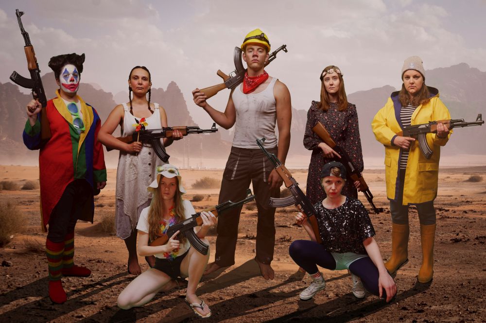 So ähnlich steht es in Philipp Löhles Farce „Feuerschlange“, die den Waffenhandel thematisiert. Im Zentrum: Der Waffenproduzent „Lecker und Loch“, unschwer als Heckler und Koch zu entlarven, der bekanntlich gerade in einen abstrusen Streit mit einem ostdeutschen Konkurrenten um einen Auftrag der Bundeswehr verwickelt ist. Regisseur Tim Mrosek inszeniert diese Farce als Diplominszenierung der Theaterakademie Köln. Das hat nicht nur mit dem aktuellen Thema zu tun. Diplominszenierungen sollten den Absolventen „Möglichkeiten bieten, sich variabel zu zeigen“ und es sollten alle möglichst gleich vertreten sein, so Tim Mrosek. Alle drei Aspekte bedient Löhles „Feuerschlange“ reichlich. Deutschland gehört zu den wichtigsten Waffenproduzenten und -exporteuren weltweit und Heckler und Koch ist ein internationaler Player erster Güte, den Löhle auf wunderbar groteske Weise beim Geschäftemachen zeigt. Sein Stück ist zudem ein gewaltiges Kaleidoskop mit zahlreichen Rollen, das Szenen mit Lecker und Loch und den Bundesministerien neben Szenen aus einem Klassenzimmer oder mit indigenen Göttern stellt – ein szenisches Materiallager mit völlig unterschiedlichen Atmosphären des Grotesken.