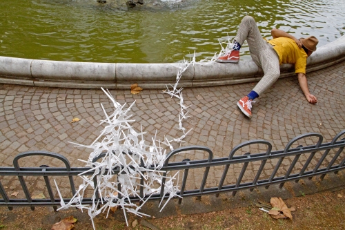 Dass der zur billigen Fressmeile heruntergekommene Hohenzollernring auch einen sehr profanen Bezug zur Plastikgabel herstellt, ist offensichtlich. Da ist es nur stimmig, wenn Laura Susanna Burgener vor einem leerstehenden Gebäude ihren schmalen Körper wie ein Drogenopfer auf dem Gehsteig platziert, glasig auf die Gabeln in ihrer Hand starrt und kaum reagiert, wenn andere Performer ihr das wertvolle Plastikgut entwenden. „Forks in the City“ fällt ins Genre der Stadt-Intervention und öffnet ein fast unüberschaubar weites Assoziationsfeld, das die eigene Fantasie nach Lust und Laune beackern kann – auch wenn man nicht gleich 24 Stunden dabei bleiben muss.