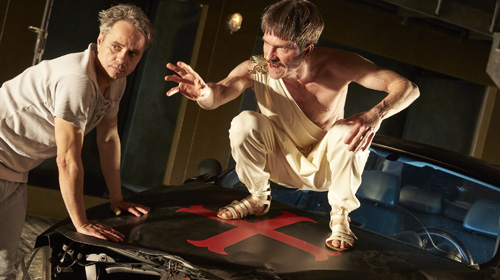 Die Hölle kann sehr kalt sein. In Dante Alighieris gewaltigem Epos „Die göttliche Komödie“ leiden die Bewohner nicht nur im brüllenden Flammenmeer, sondern auch im Eis der ewigen Verdammnis. Im Schauspiel Köln ist dieses Eismeer zu einem schneebedeckten Sandkasten geschrumpft. Vor einem Motel-artigen, doppelstöckigen Flachbau mit dem Schriftzug Via mala (Bühne: Thilo Reuther) liegen ein Autowrack und ein eisiger Spielplatz, der zugleich Friedhof und Bühne für die Verdammten ist.