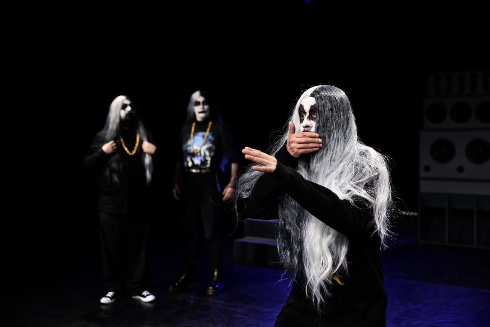 Nach seiner Produktion zum problematischen Sprachgebrauch im Rap sucht Tim Mrosek nun die sprachliche Demarkationslinie zum Rechtsradikalismus auf. Die vier Performer:innen mit ihren langen grau-weißen Perücken, ihrem Black-and-white-Makeup, den schwarzen Klamotten fungieren dabei als Katalysatoren, durch die der problematische Sprachgebrauch hindurchgeht, die ihn kritisieren, ihn aber auch vorantreiben. Vor vier monumentalen Boxentürmen, die später zu Treppen umfunktioniert werden, lässt das Quartett Joseph Goebbels und die Drogensucht Adolf Hitlers aufleben, streift Victor Klemperers Untersuchung zur Sprache des Nationalsozialismus („LTI“) und gerät über jede Kurzbio in Verzückung. Dass Black Metal mit Mythengeraune und Gesangsstil selbst Parallelen zum NS aufweist, das sei nur nebenbei erwähnt. Von abgründiger Ambivalenz ist dann der Verweis auf Edward Bernays, den Neffen Sigmund Freuds und Erfinder des Marketings bzw. der Propaganda. Die von der Rechten geübte Praxis der ständigen öffentlichen Wiederholung von Begriffen mit strategischer Absicht geht letztlich auf ihn zurück. Der Abend zeigt, wie durchlässig die Grenzen zwischen Propaganda, Werbung und PR sind, die letztlich allen politischen Richtungen offenstehen, von Neonazis bis zu strikter Wokeness.