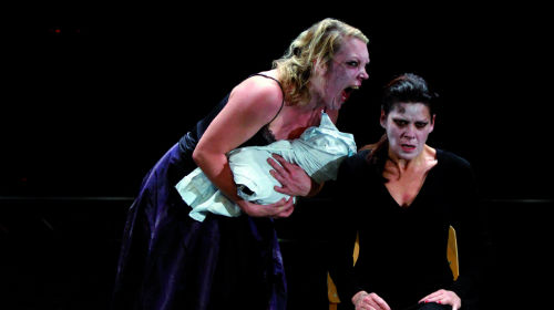 Regisseurin Karin Beier verabschiedet sich vom Kölner Publikum mit „Die Troerinnen des Euripides“ von Jean-Paul Sartre, das als Reflex auf den kolonialistischen Algerienkrieg entstanden ist und in Köln mit Texten von Nietzsche über Beckett bis Pasolini angereichert wird. Zu Beginn macht die Regie allerdings viel pseudoarchaisches Brimborium: Die Frauen stoßen wilde Klagelaute aus oder skandieren griechische Verse. Vor allem die Kassandra der Rosalba Torres Guerrero stürzt sich mit der Prophezeiung vom Untergang der Griechen in euphorische Tänze. Das Pathos wabert schwer durch die Halle der EXPO I.