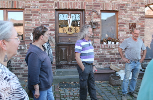 Unter der Leitung von Jörg Fürst (Atonal Theater) und Rosi Ulrich (theater51grad) lauschten die Mitreisenden zunächst einem Audio-Feature (Bassem Hawar) über Utopien, der menschlichen Beziehung zu urbanen Räumen und der Beschleunigung der Gesellschaft. Basis der Exkursion war die Foto-Reihe „Revier“, in der Matthias Jung die vom Braunkohletagebau vertriebenen Städte und deren BewohnerInnen porträtierte. Ein herrlich warmer Tag im goldenen Oktober, eine entspannte Stimmung und eine bizarre Mission: Orte aufzusuchen, die dem Untergang geweiht sind. So ging es hierbei weniger um Theater als um Zeitgeschehen, um Kunst, die näher am Menschen ist als so manche Berichterstattung. Als Guide dieses einzigartigen Projekts stellte sich Hubert Perschke vor. Der Fotograf und Aktivist der Initiative „Buirer für Buir“ dokumentiert die Geschehnisse am Abbaugebiet als Beobachter und ist durch seinen Wohnsitz doch mittendrin.