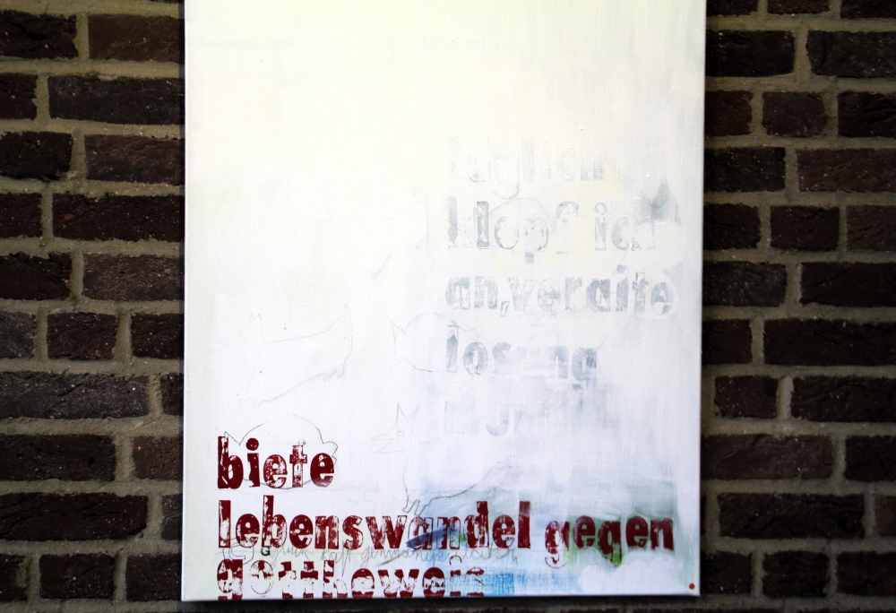 Die Zeichen stehen auf Verwirrung, nur um mit provokanten Aussagen temporären Halt zu suggerieren. Dabei offeriert das Einstiegsbildnis im Tagungshaus der Katholischen Kirche auf der Kardinal-Frings-Straße einen fairen Deal: „biete lebenswandel gegen gottesbeweis“ heißt es da in purpurnen Buchstaben auf leichenweißem Hintergrund. Auf dem Boden, nach unzähligen Variationen aneinandergelegt, ließen die Arbeiten vielleicht einen Atlas erkennen, der die Betrachter:innen in ein Zentrum führt, das entscheidende Antworten beherbergt. Erstens: Gott existiert, aber er oder sie weiß nichts davon. Zweitens: Die beste aller Ideen ist die Liebe. Und drittens: Ordnung ist eine Illusion, die der Humor sich ausgedacht hat. Mit dem Text-im-Bild-Hinweis, „bitte keine Seeigel auf der Straße herumliegen lassen“, erfüllt die Ausstellung zudem ihren Bildungsauftrag. Diese altruistische Einstellung gilt es in einer egomanen Kunstszene wertzuschätzen. Im Ernst, Julja Schneider gelingt mit ihren Arbeiten im wahrsten Sinne des Wortes ein Kunststück, denn sie überzeugen die Betrachter:innen, Zeit zu opfern. Zeit für die Faszination von krummen Linien, die die Rechtshänderin mit links zog, für angenehme Farbtöne, die nicht blenden, für Amüsement und Schrecken in bizarren Comic-Miniaturen, für fehlende Informationen zu Titeln, verwendeten Materialien oder Formaten, die nur ablenken, und schließlich für eine fundamentale Philosophie, die nichts erklärt, aber klare Aussagen beinhaltet. Tun Sie sich das um Gottes Willen an!