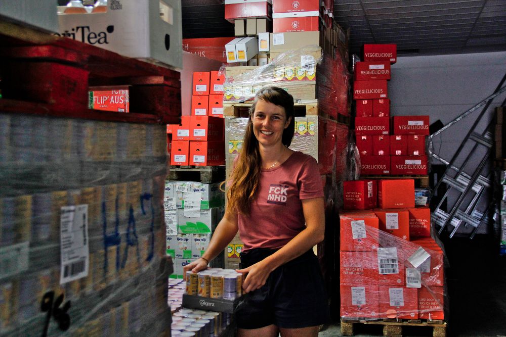„Die Supermärkte dürften es noch verkaufen, wollen aber nicht“, sagt Nicole Klaski, Gründerin und Geschäftsführerin von The Good Food, „die Kunden wollen frische Ware“. Sie organisiert im Lager die Logistik, mehrmals im Monat kommen Lieferungen von Unternehmen. Die Lebensmittel landen anschließend in einem der drei The Good Food Läden in Köln Ehrenfeld, Sülz und im Agnesviertel. Heute sind Studentinnen ins Lager gekommen, die einen halben Lieferwagen beladen für das Sommerfest ihrer Akademie.