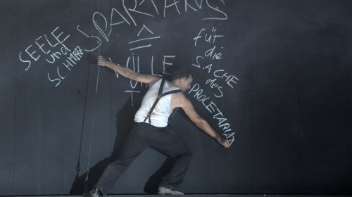 Döblins im Exil entstandener Roman ist ein Requiem der deutschen Geschichtsmisere, das den historischen Gestalten mit ihren privaten Malaisen den Lehrer Friedrich Becker zur Seite stellt, dessen Leben wiederum mit den Zeitläuften aneinandergerät. Ein schwer vom Krieg Traumatisierter, von Sören Wunderlich bis zum gläubigen Neurotiker getrieben, der tastenden Schrittes – Beckmann lässt grüßen – sich zurechtzufinden versucht. Seine Freundin wirft sich einem Freikorpskämpfer an den Hals, er unterrichtet völkische Schüler und versucht, seinen schwulen Schuldirektor zu verteidigen. Überall lauert als Beweis historischen Scheiterns schon die Restauration, angetrieben von einem an Bulgakow erinnernden, charismatischen Satan (ebenfalls Alois Reinhardt). Die Regisseurin nutzt die Vorlage für einen ins Surreale übersteigerten Bilderbogen, lässt die Körper zucken und zappeln. Doch Döblins unverbundene Romanebenen bekommt sie damit nicht in den Griff. Da nutzt es auch nichts, dass Rosa als Beobachterin in fast jeder Szene präsent bleibt. Der vierstündige Abend zerfällt so sukzessive immer mehr in Einzelszenen, der große Erzählbogen fehlt – das Durchrauschen der Revolution.