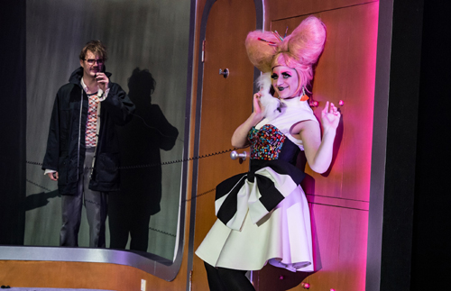 Selbstverständlich arbeitet „Die Mitwisser“ den aktuellen Themenkatalog gewissenhaft ab. Theos mühselige Wissensaufbereitung am Resopalschreibtisch wird allmählich von Kwant übernommen, während sein Herrchen auf der Yogamatte sich auf physische Selbstoptimierung konzentriert. Ehefrau Anna Glass (Tanja Schleiff) unterwirft sich nach anfänglicher Kritik der Kwantschen Psychoevaluation, küsst den Avatar und macht mit ihm einen Online-Blumenhandel auf. Lou Strengers Sabrina, Ex-Arbeitskollegin und Teilzeitgeliebte Theos, verlegt sich als Schminkgirl „Babsi Bunt“ ebenfalls auf ein Online-Dasein. Algorithmisch-reaktionäre Geschlechtertypologie. Theo ähnelt schließlich dem rebellierenden Winston Smith aus Orwells „1984“ und gibt ein absurdes Interview voller aufklärerischem Pathos – während die sich rasant vermehrenden Kwants als deus in machina über das Beleuchtungsgitter an der Decke der Spielstätte Central kriechen und selbst noch die Kritik an der eigenen Herrschaft steuern. So lustig können Dystopien aus der zukünftigen Vergangenheit sein!