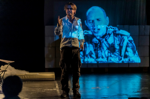 Leky, der zuvor mit dem Regisseur Gockel eine riskante Reise in den Kongo unternommen hat und diese über ein Video dokumentierte, ist ein charismatischer Performer in dieser One-Man-Show, mit seinen Reiseerlebnissen und Reflexionen, mit einem prall gefüllten Seesack und dem Film, aus dem er immer wieder Müller-Texte nachspricht. Ein Theater-Abenteuer im Dickicht des Neokolonialismus, exotischer Faszination und deutscher Schuld: der Weg Müllers vom einfachen Soldaten zum monströsen Medienstar aus dem militärischem „Kommando 52“. Im Wechselgespräch ahmt Leky auch Martin Kobler nach, der die Friedensmission der Vereinten Nationen im Ostkongo leitet: „die größte, teuerste und erfolgloseste UN-Mission aller Zeiten“. „Das Deutsche Wesen“ zur Genesung der Welt – eher verwirrend. Und Leky bindet das Publikum immer wieder mit ein.