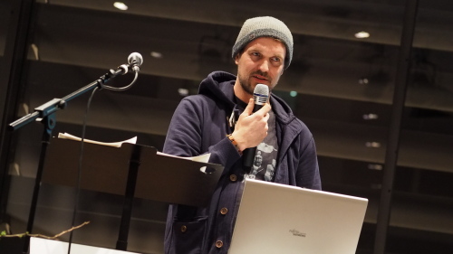 „Ich habe ja, wie einige wissen, vor zehn Jahren, in einer Brache, die schon 20 Jahre leer stand eingegriffen und dort den Besen sprechen lassen. In zehn Jahren sind 10.000 qm städtisch vermülltes Gelände umgewandelt worden. Ich kann aus diesen zehn Jahren berichten von jeder Menge teuren Übergriffen seitens der Stadtverwaltung, also Behinderungen dieser Tätigkeit, keiner Förderung. Das letzte Beispiel jetzt: Man hat mir eine Unterschrift abgepresst, dass ich am 30. April – was ich auch immer schon angekündigt habe – das Gelände verlasse. Und jetzt gab es einen Polizeieinsatz gegen eine meiner Bauten, mit dem ich weiterwandern wollte. Durch diese Unmöglichkeit, mit der Verwaltung zu kommunizieren, sind zwei Tage vor Weiberfastnacht um halb 7 insgesamt 80 Personen auf dem Eifelwall aufgelaufen, die alle bezahlt waren. Davon waren 65 Polizeibeamte, fünfmal Gebäudewirtschaft, fünfmal Bauaufsichtsamt und eine Zimmerei, die rekrutiert wurde, fünf Dachbalken bei mir abzusägen. (…) Die greifen bei einem stadtbekannten Künstler, der sich berufen fühlt, Landschaft umzuwandeln, in dieser Form ein. Jetzt ist das ganze Gelände wie schon mal sieben Monate vorher mit Hundestaffeln, mit Wachleuten bewacht. Das kostet im Monat – so habe ich von den Wachleuten gehört – über 30.000 Euro. Also wir können ganz klar sehen, wo unsere Gesellschaft bereit ist, Geld zu investieren.“ Bewacht würden damit leerstehende Garagen. Weltweiten Entwicklungen in der Stadtpolitik hinke Köln schon seit den 70er Jahren weit hinterher und es brauche einen „richtig starken Weckruf“.